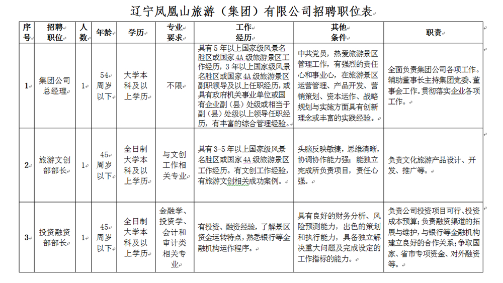 辽宁凤凰山旅游(集团)有限公司总经理1名;旅游文创部部长1名;投资和融资工作部部长1名。